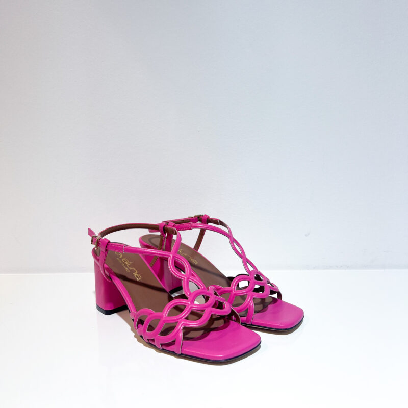 Sandalen mit Riemen aus Velourleder in Fuxia. Die Riemen sind komplett mit goldfarbenem Leder gefüttert. Das weiche Lederfußbett mit Label-Prägung rundet zusammen mit der Ledersohle und dem ca. 1,5cm hohen Absatz den Tragekomfort ab.