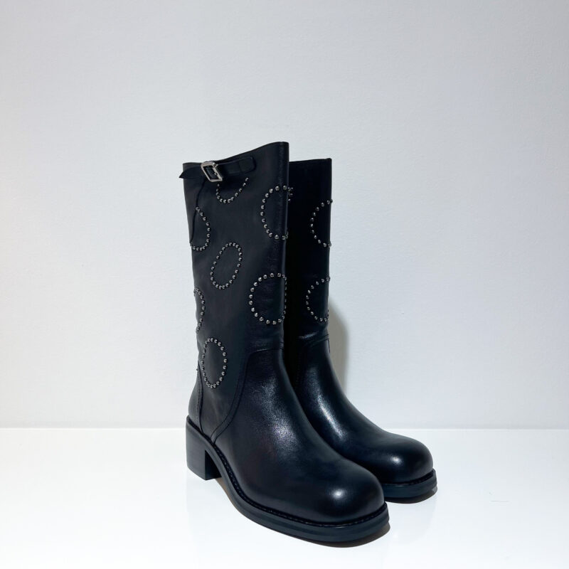 Stiefel aus schwarzem Kalbsleder mit Nietendetails auf dem Schaft. Der seitliche Reißverschluss geht bis zur Schaftmitte. Die Kappe hat eine leicht abgerundete Karreeform. Der ca. 4cm hohe Absatz und die rutschhemmende Gummisohle runden den Tragekomfort ab.