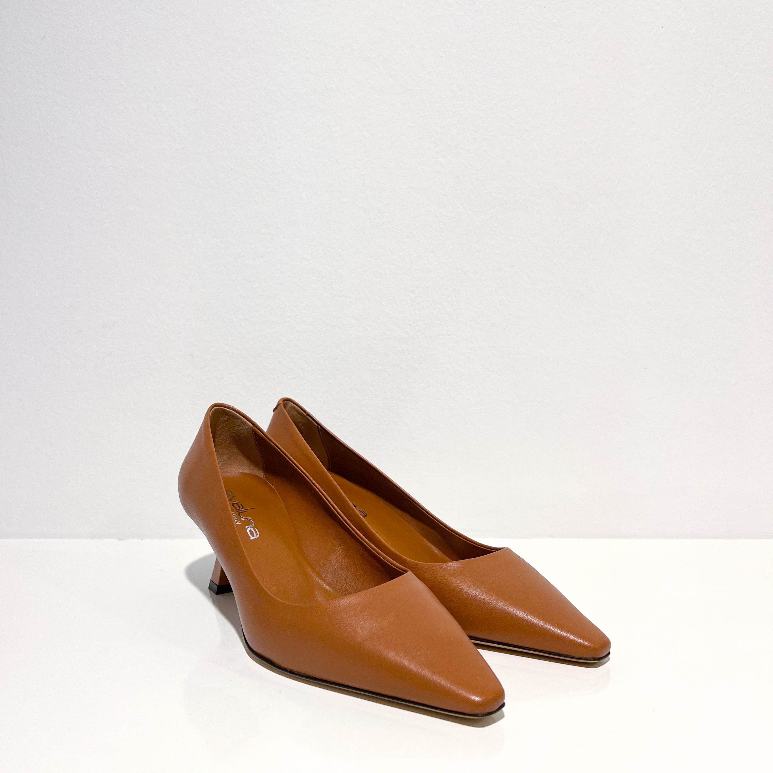 Pumps aus cognacfarbenem Kalbsleder mit mandelförmiger Vorderkappe und kompletten Lederinnenfutter. Der skulpturale Absatz ist ca. 5cm hoch. Abgerundet wird dieser Klassiker durch eine Laufsohle aus Leder.