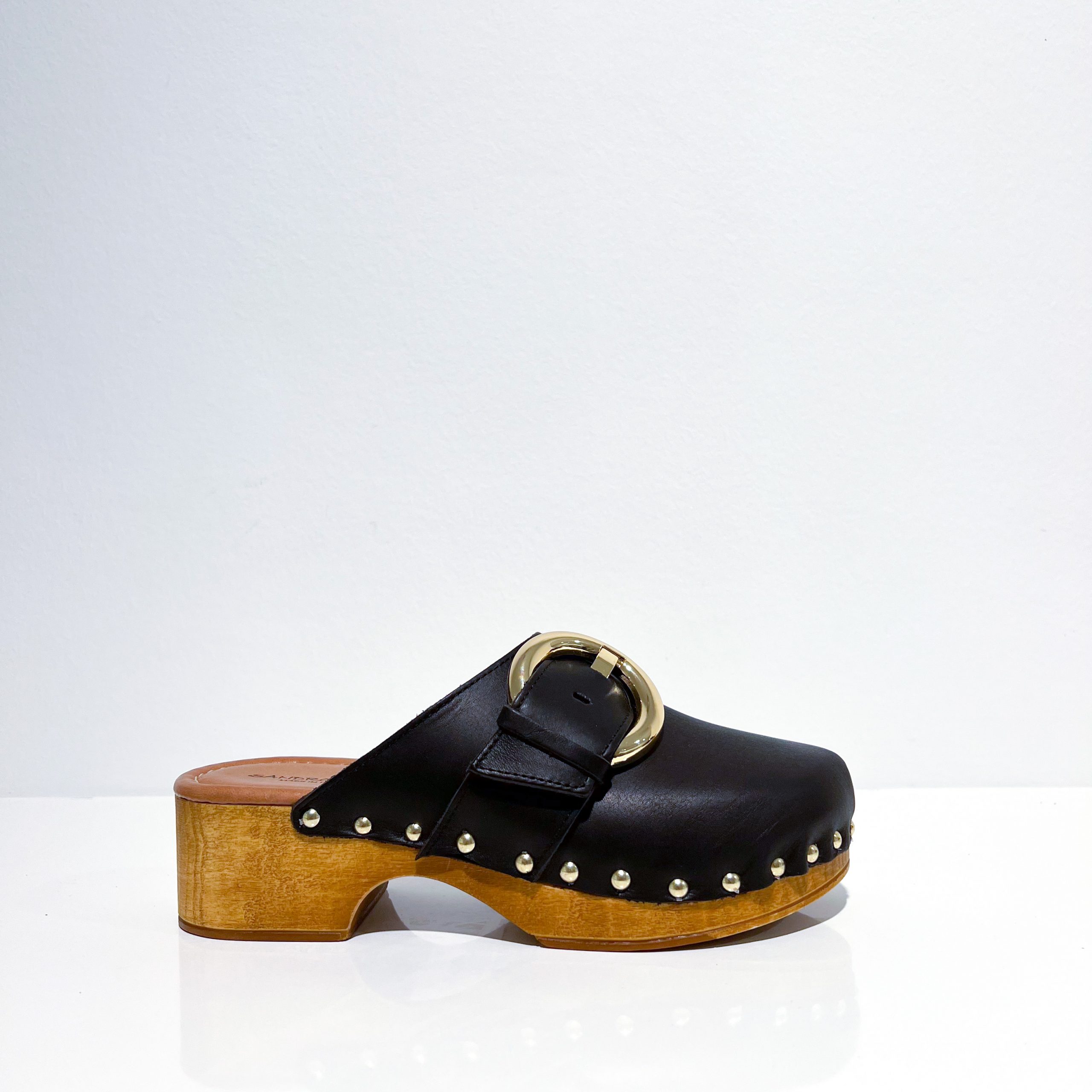 Holz-Clog mit schwarzer Kappe aus Kalbsleder und verstellbarem Riemen mit Dornschließe. Das Plateau ist 1,5cm hoch, der Absatz 4,5cm. Abgerundet wird das Modell durch das weiche Lederfußbett.