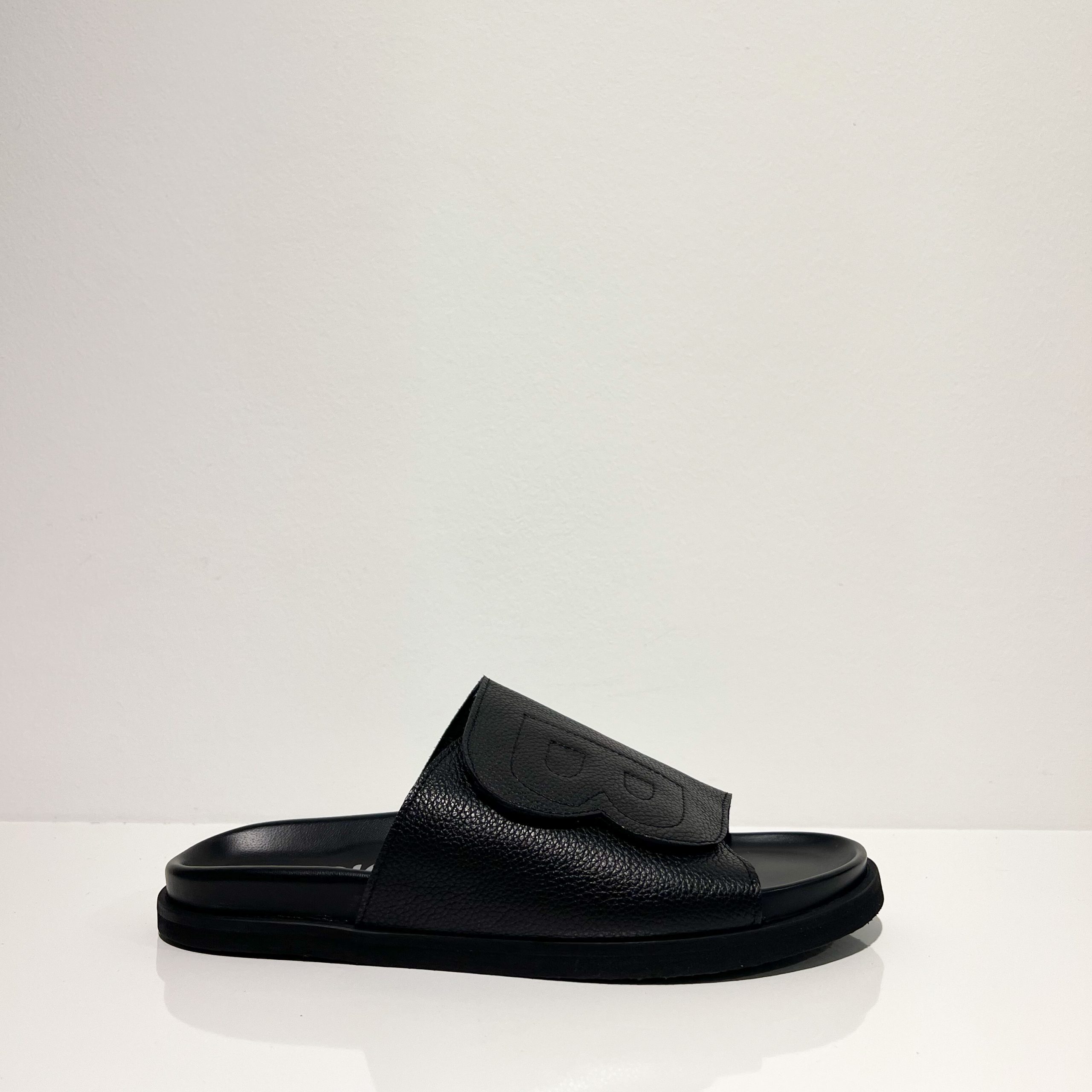 Sandalen aus geprägtem Kalbsleder in Schwarz. Der Riemen ist mittels Klettverschluss in der Breite verstellbar. Logo-Steppung über dem Verschluss. Das weiche Lederfußbett und die rutschhemmende Gummisohle runden den Tragekomfort ab.